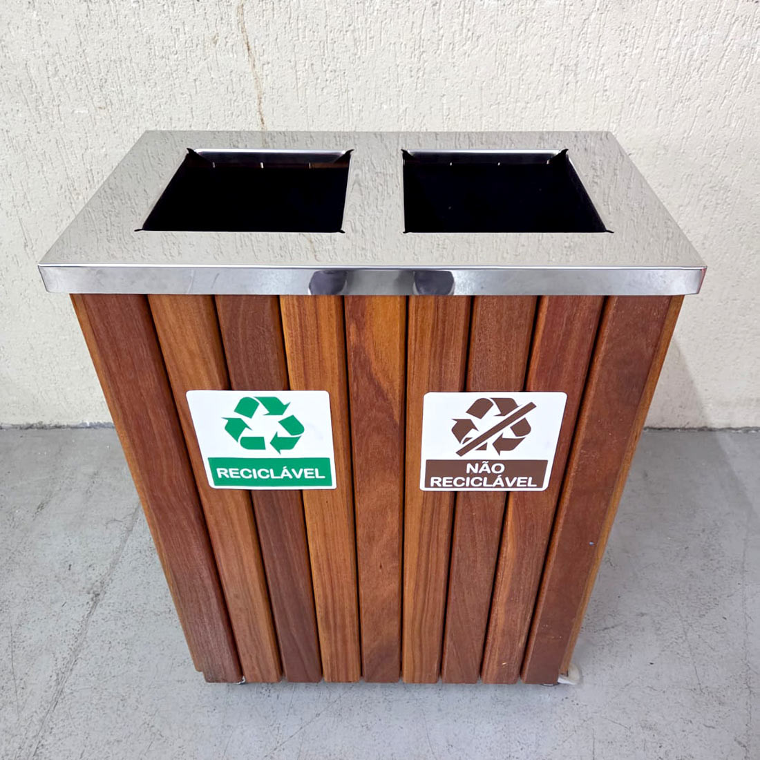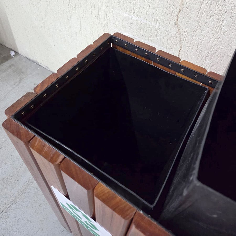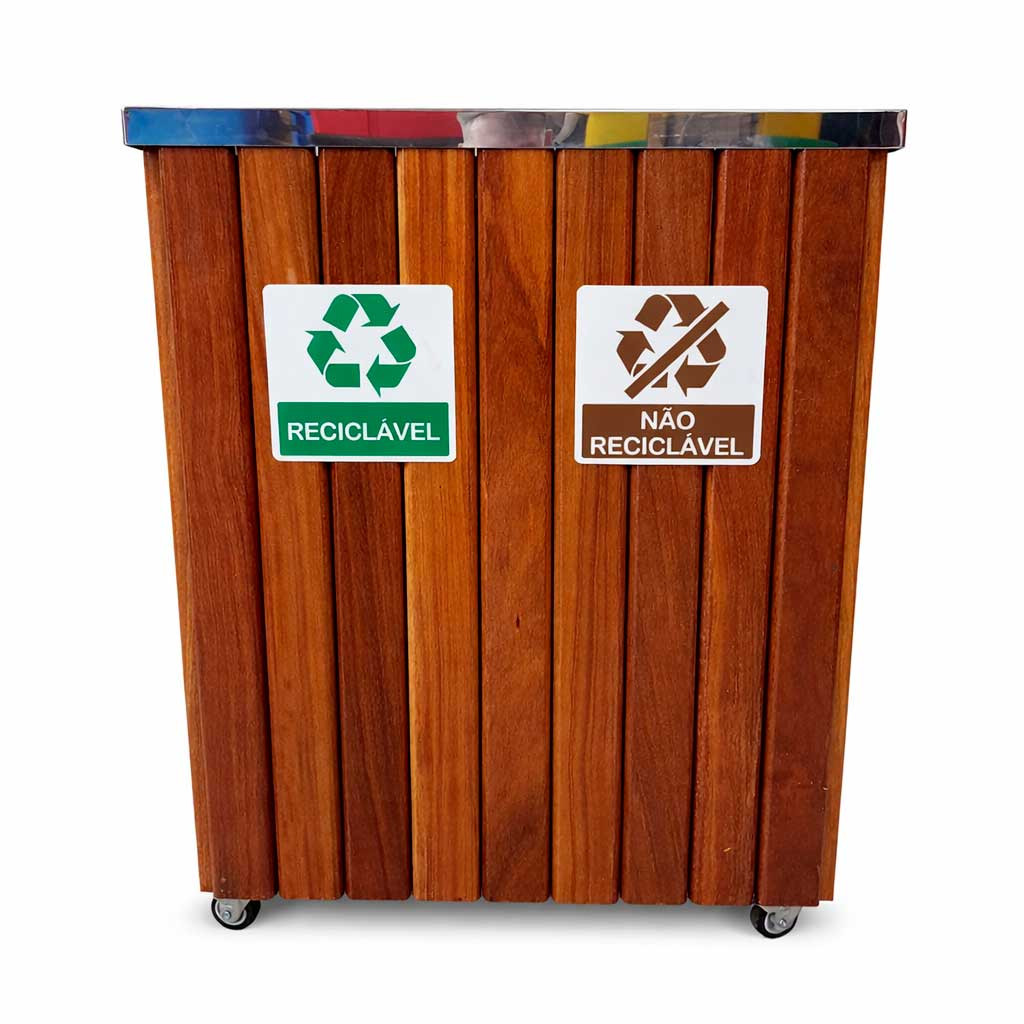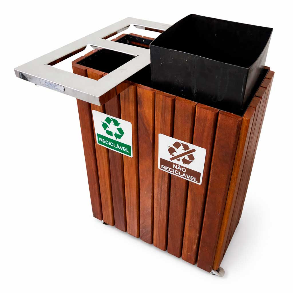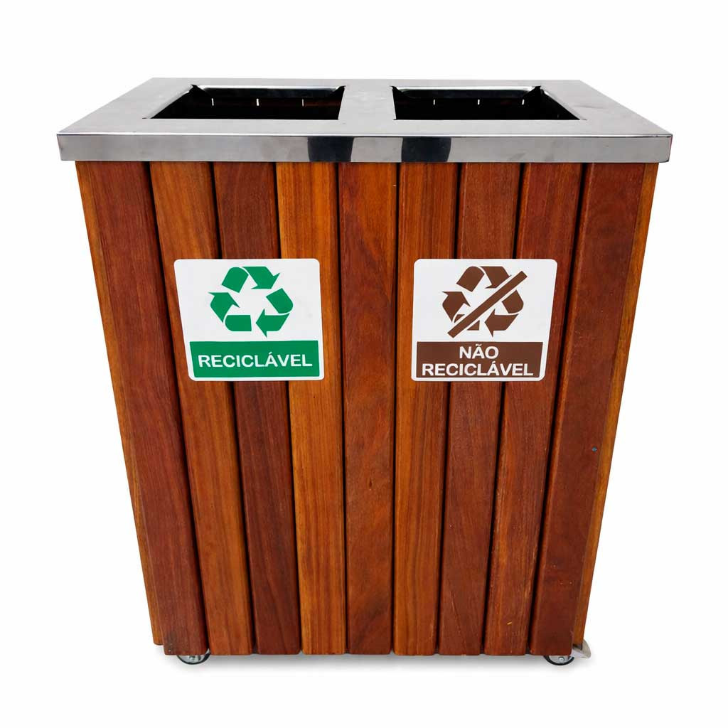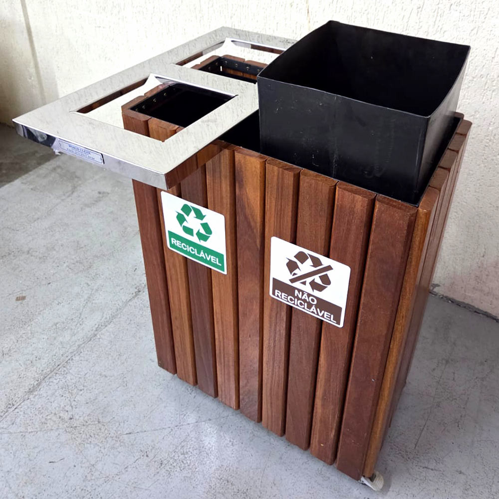 Fabricada em madeira nobre (Cumaru) com acabamento de 3 demãos de verniz naval, esta lixeira oferece máxima proteção contra as ações do tempo. Sua tampa superior é construída em Aço Inox 430 Polido com duas aberturas direcionadas, garantindo higiene e um visual premium. O sistema já vem pronto para a separação de resíduos, acompanhando placas de identificação visual claras e dois cestos internos de alta durabilidade.